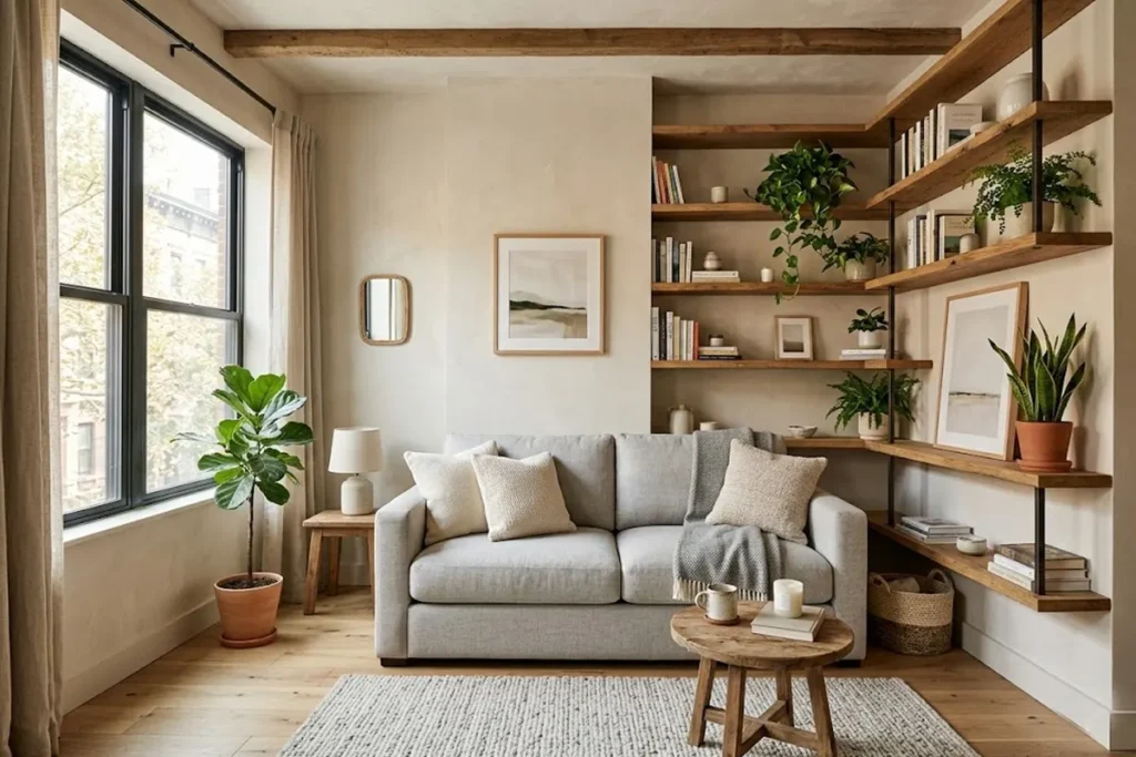 Ans.: Yes, absolutely. Modern rustic living room ideas work beautifully in small spaces. In fact, the neutral palette and minimal approach can make a small room feel bigger and brighter. Just focus on light-colored walls, one statement wooden piece, and warm lighting instead of overcrowding the space.