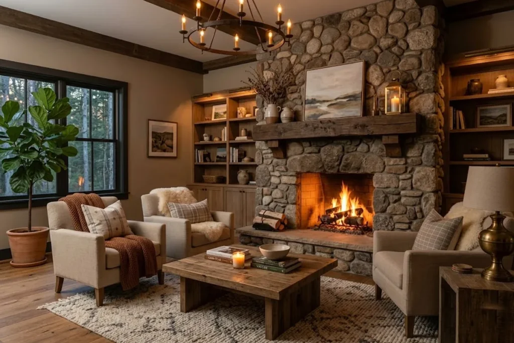Ans.: Not at all. While a stone fireplace adds strong rustic character, it’s not mandatory. You can achieve the same effect with exposed wooden beams, textured walls, reclaimed wood furniture, or even warm layered lighting. The key is natural materials and balanced design.